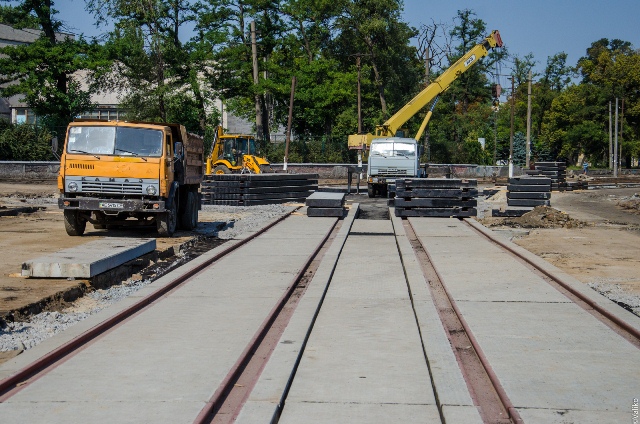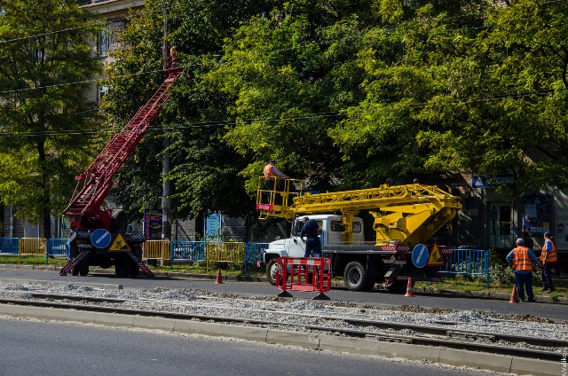 Внизу вулиці укладають безшумні трамвайні колії