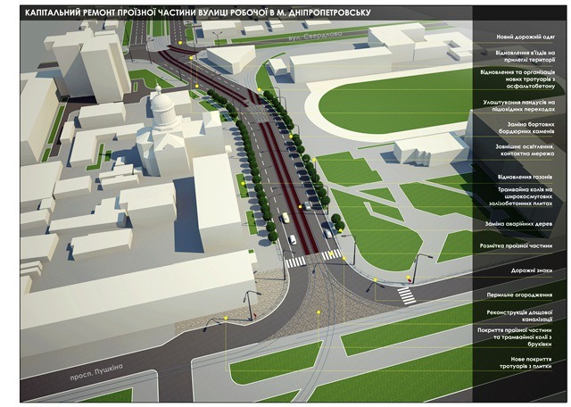 Ремонт Робочої - однієї з найбільших вулиць Дніпропетровська - виконаний наполовину. Покладений нижній шар асфальту, відремонтовані зливостоки, прибрані сухостої. Попереду - верхній шар дорожнього покриття, новенькі хвойні та листяні дерева, оновлене освітлення та пішохідні переходи з пандусами. До першого жовтня дорога повинна бути готова. До початку листопада - весь ремонт.
