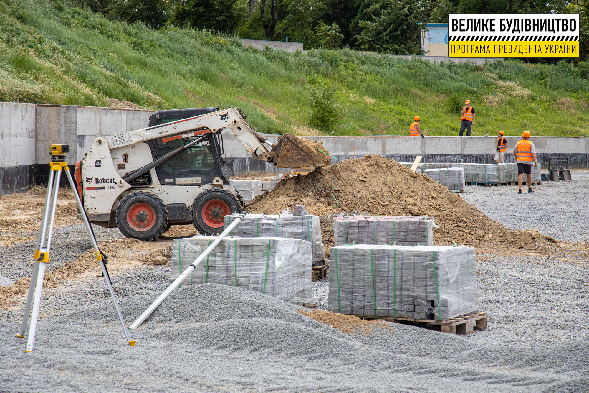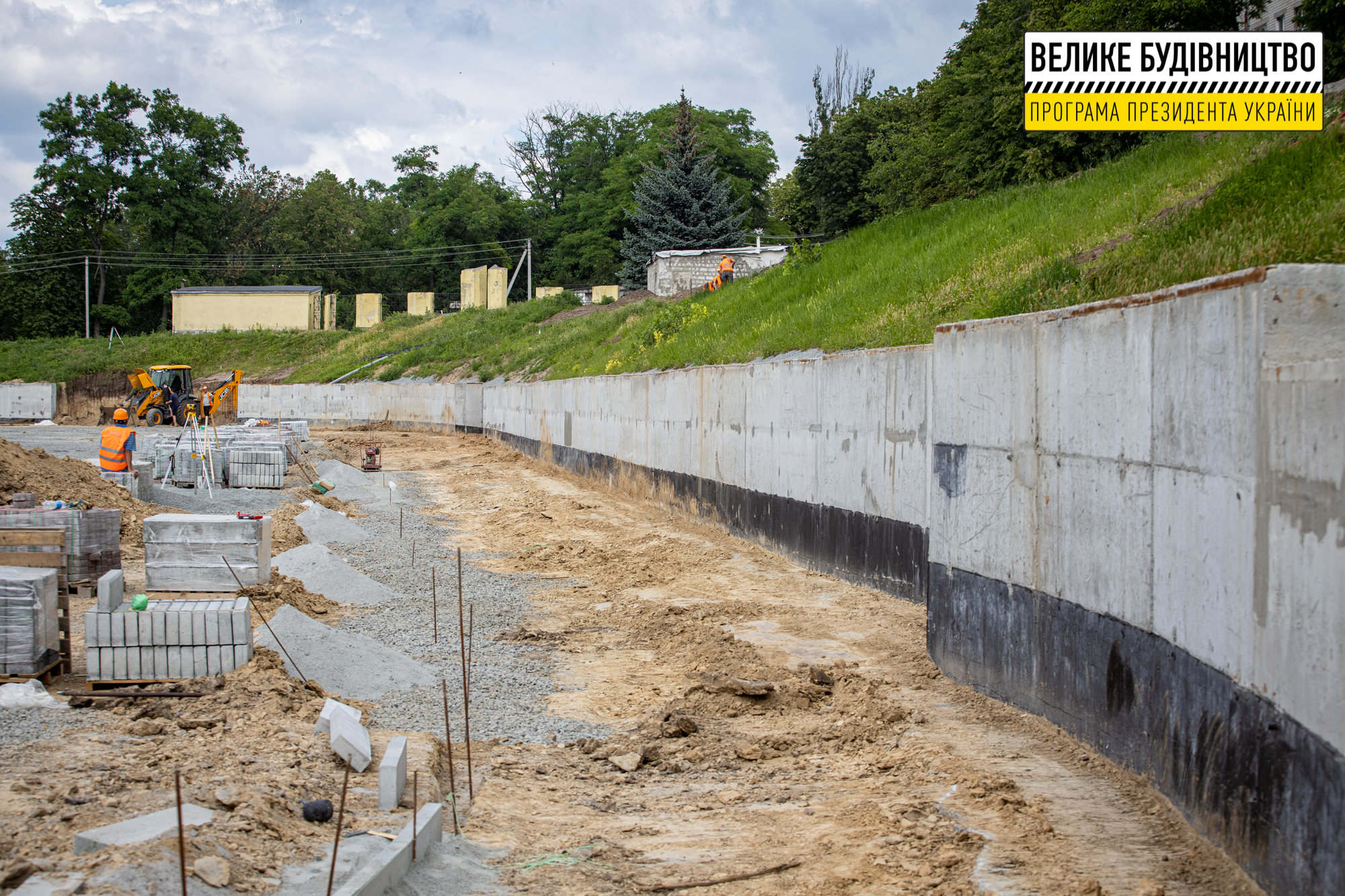 Підрядники вже звели 3-метрову підпірну стіну, зробили дренажну систему навколо стадіону. Облаштовують плиткою центральний вхід, проводять освітлення.