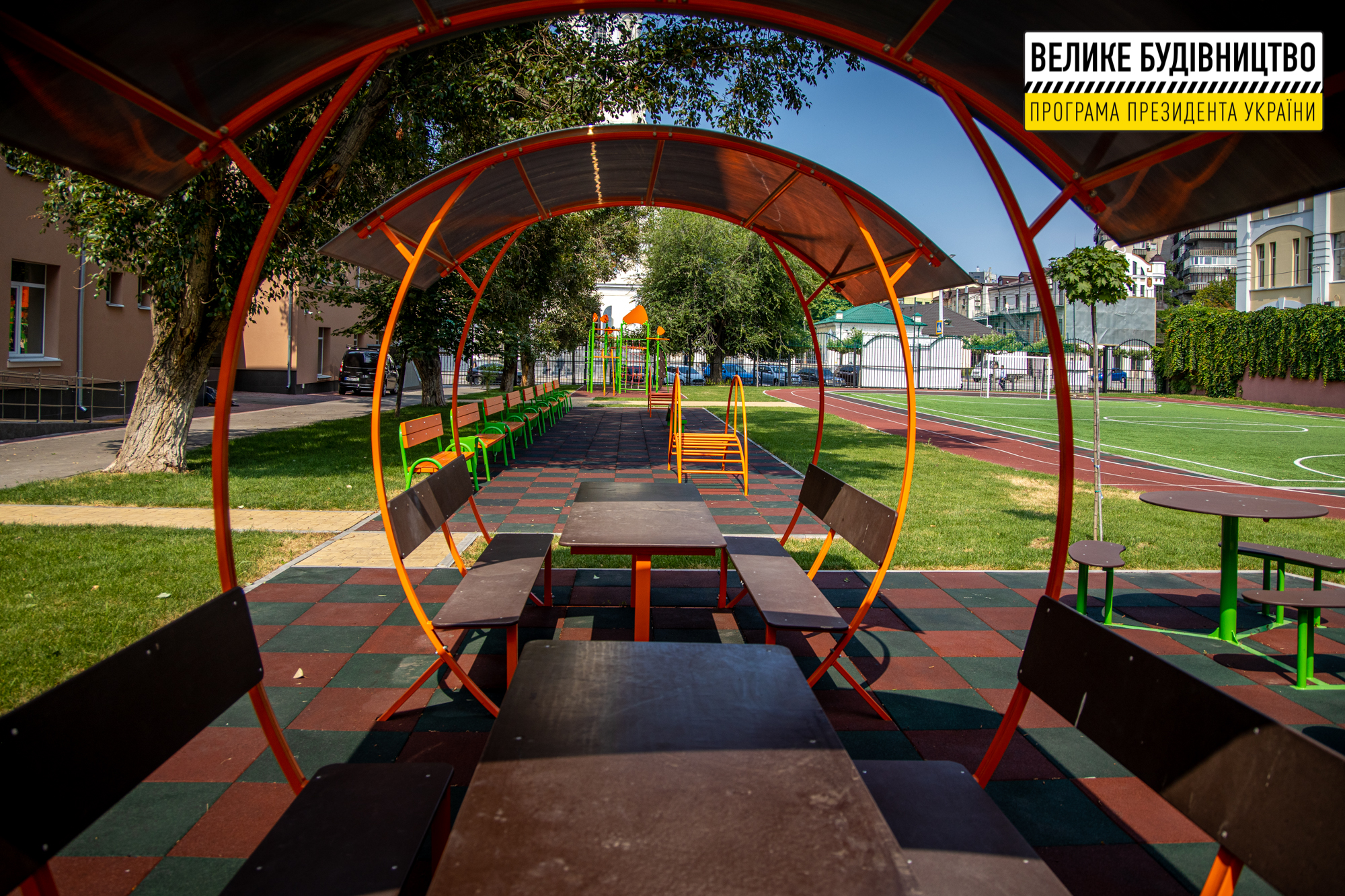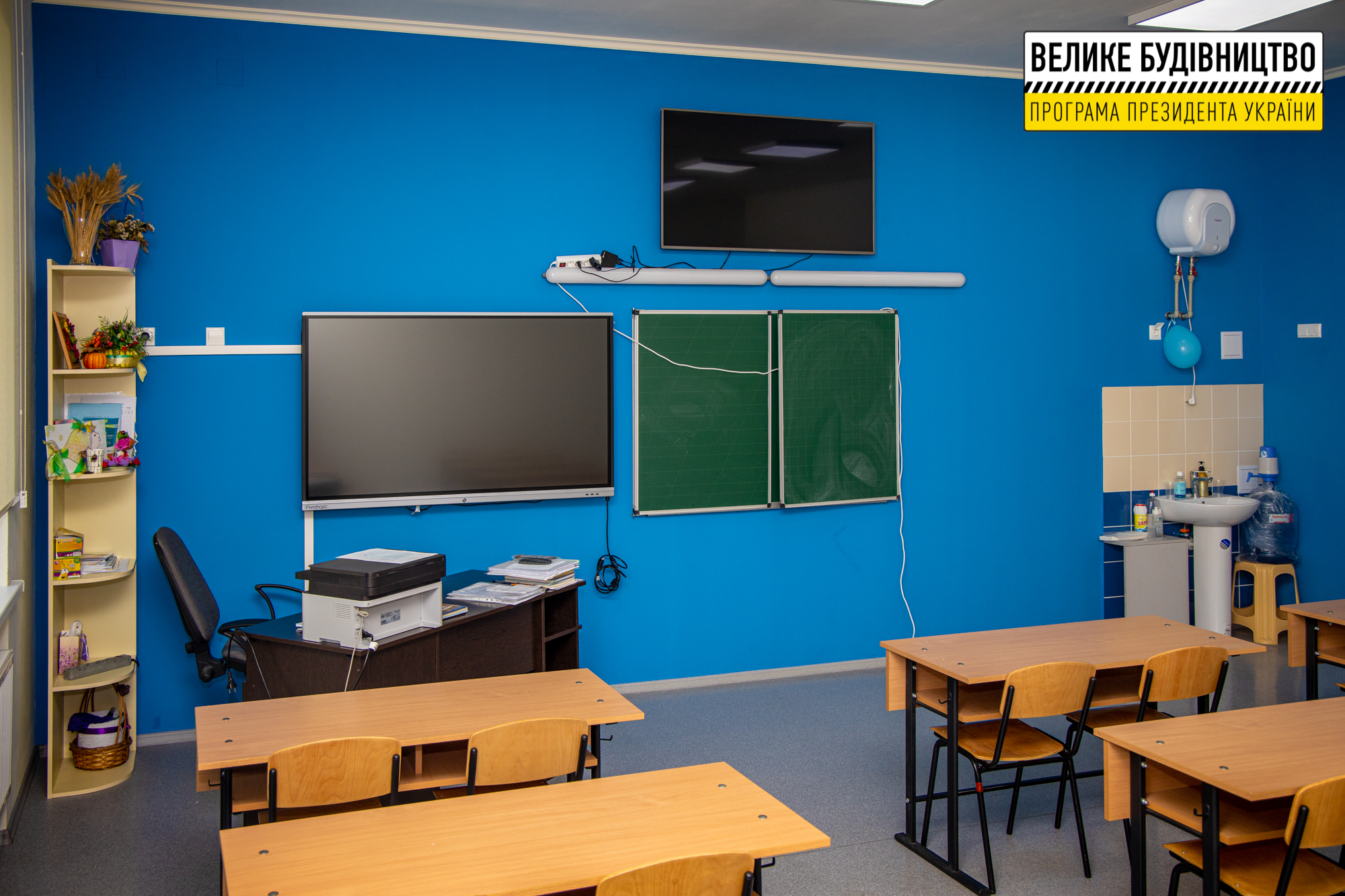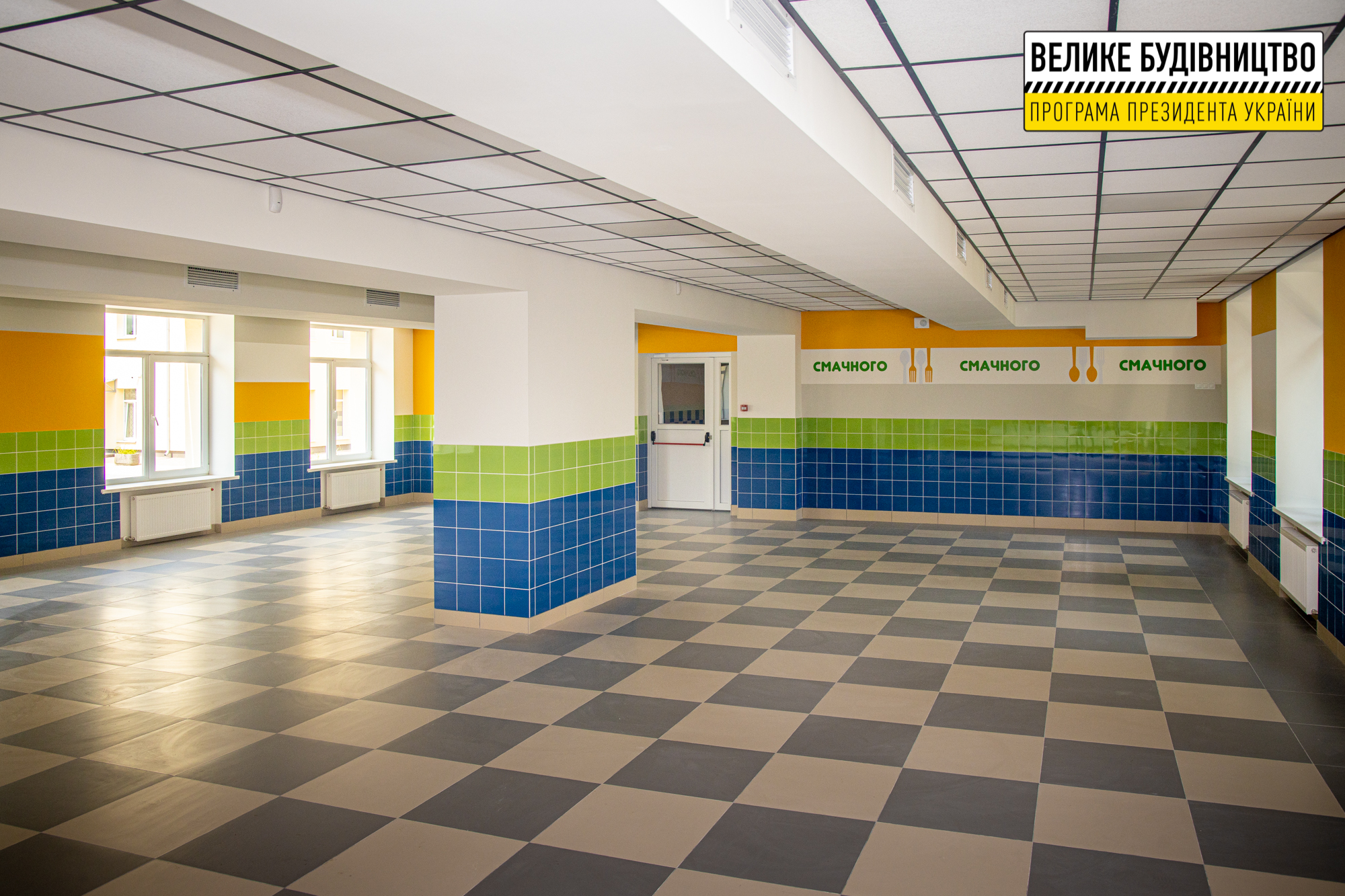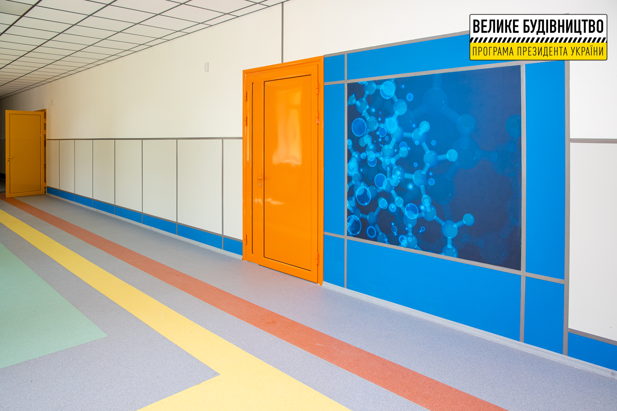 Всюди яскраві акценти – тематичні фотошпалери й панно, різнокольорові стіни. Роботи виконані за програмою Президента України Володимира Зеленського «Велике будівництво».