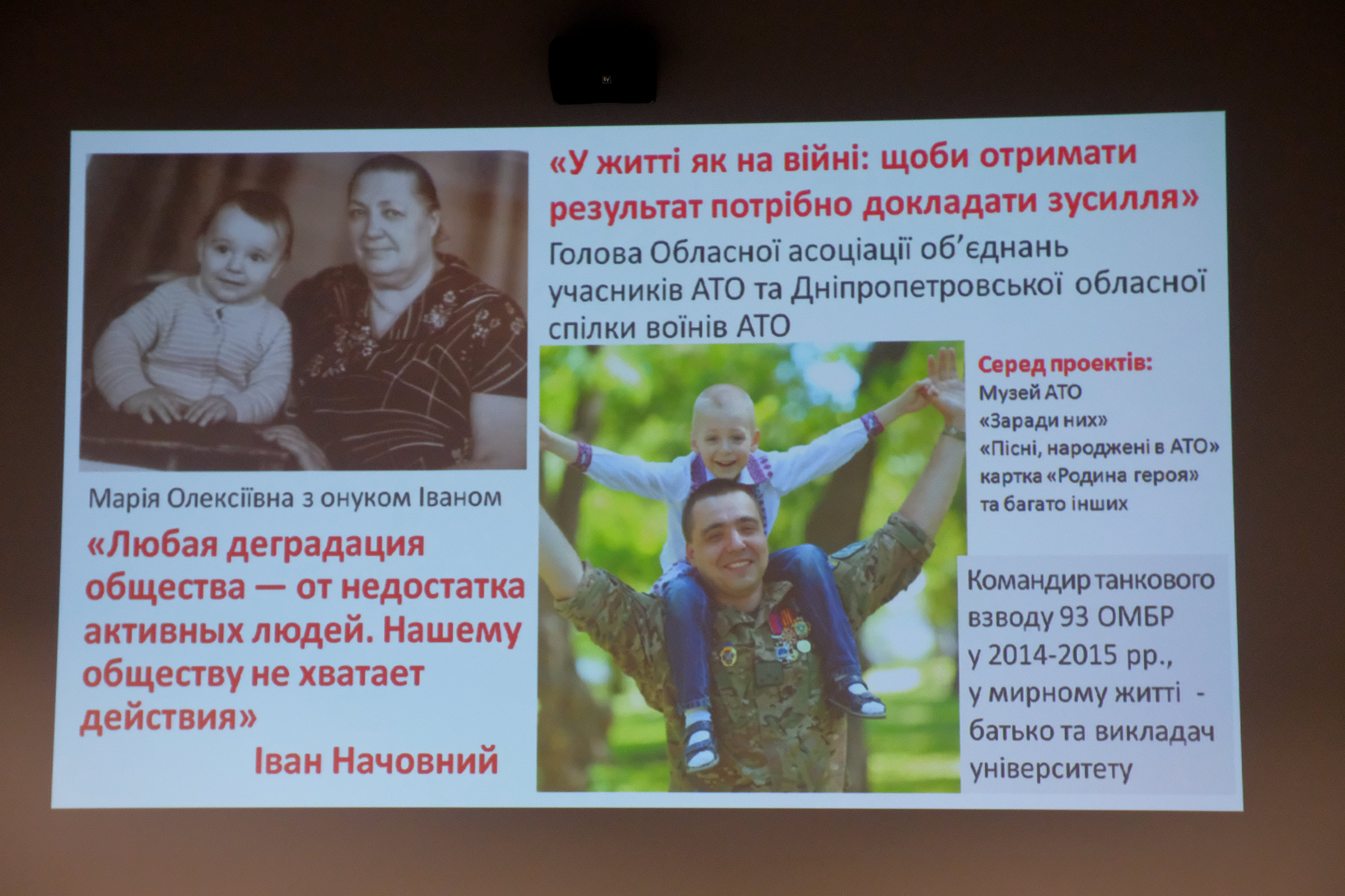 «По материнській лінії воювали і дідусь, і бабуся. Дідусь у 1939 році відступав з радянськими військами з Польщі до Сталінграду. Там тримав свій останній бій і був комісований. Після війни довго доводив, що був її учасником. Адже за офіційною версією війна почалася в 41-му, а не в 39-му. У бабусі також була цікава доля. Вона пройшла військовий шлях від командира розвідвідділення до командира взводу управління протиповітряної оборони. Отримала медаль за взяття Кенігсбергу», – розказав голова обласної спілки воїнів АТО Іван Начовний.